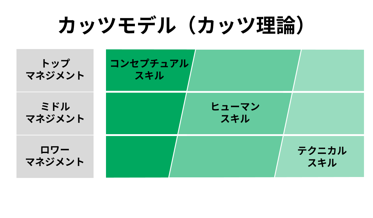 カッツモデル(カッツ理論)とは、アメリカの経営学者ロバート・L・カッツが提唱した理論で、役職に応じて求められるスキルを3つのカテゴリーに分類したものです。