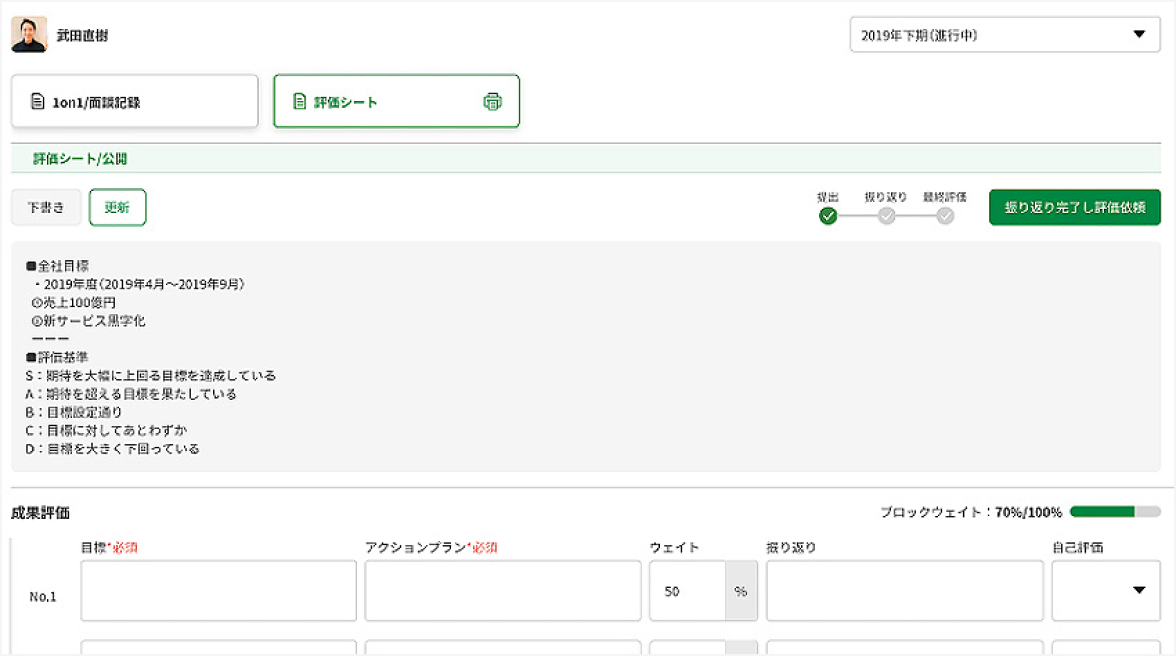 プロセスや評価基準も明確化評価納得度の向上も実現ブラックボックス化しがちなプロセスや評価基準も見える化。