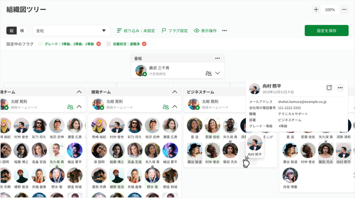 社員の顔ぶれや個性を把握コミュニケーションの活性化も実現あらゆる人材データを一元管理することで、社員の顔や個性をパッと把握することが可能です。細かな権限設定も可能で、社内コミュニケーションの活性化にも繋がります。